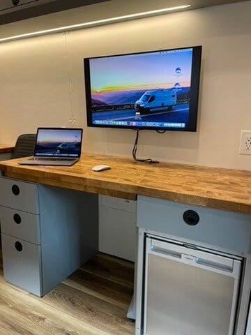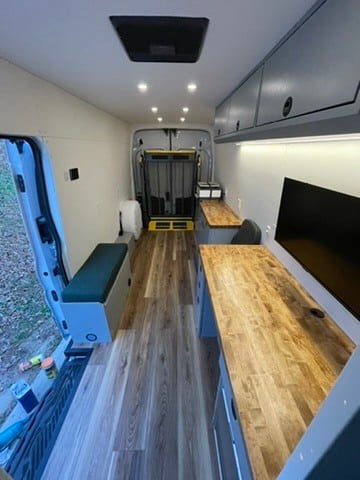 Designed as a mobile office on a Ford Transit High Roof 148EXT wheelbase, this van is built to bring essential legal services directly to those who need them most. Inside, a convertible L-shaped desk and smart monitor create a functional workspace for consultations and remote work. Climate control is handled by a Dometic RTX 2000 12V air conditioner and a Webasto heater, ensuring a comfortable environment year-round. Additional features like a jump seat and a wheelchair lift make this van accessible and accommodating for all clients.