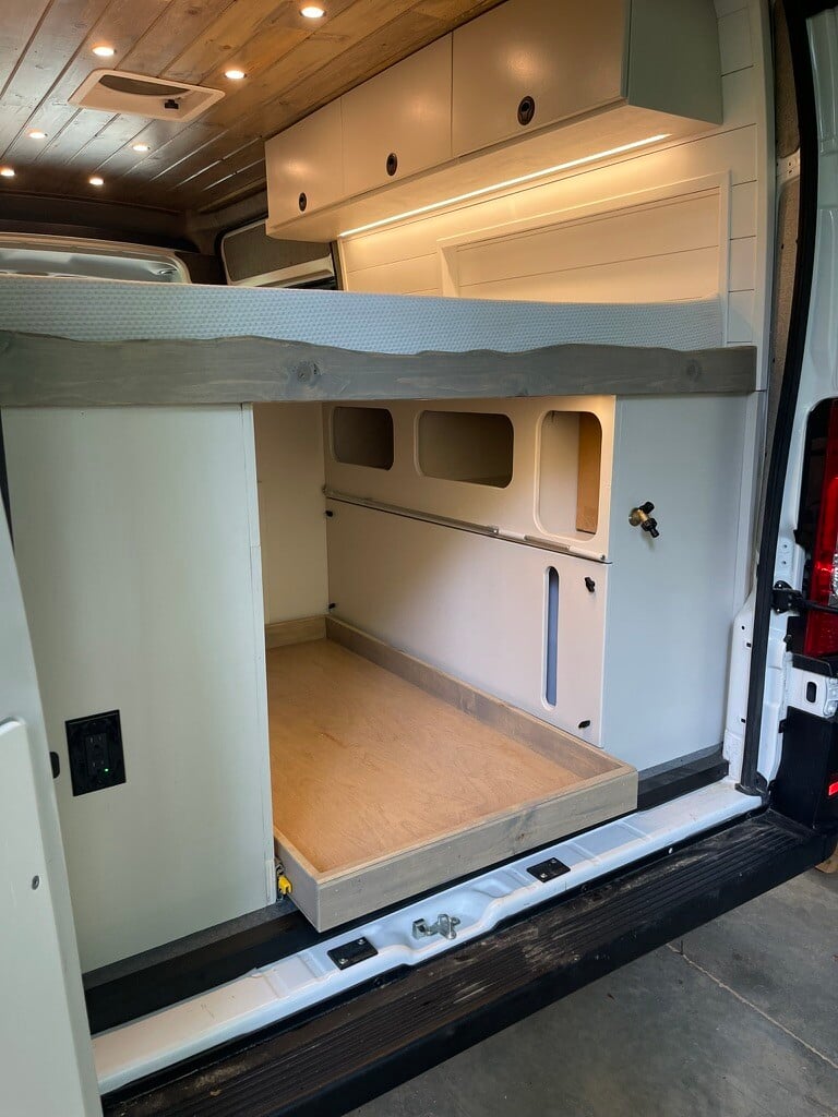 This build includes premium upgrades to enhance your experience, like Flarespace Flares for extra sleeping space, a Laveo Dry Flush Toilet for added convenience, and a microwave for quick meals. A 12V water heater ensures warm showers anywhere, while a diesel heater keeps the van cozy in cooler weather. The back door ladder provides easy access to roof storage, making every trip seamless. Whether you're heading off-grid or road-tripping in style, the Trailblazer is ready for whatever adventure comes next.