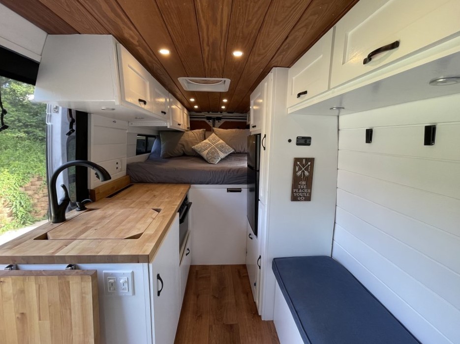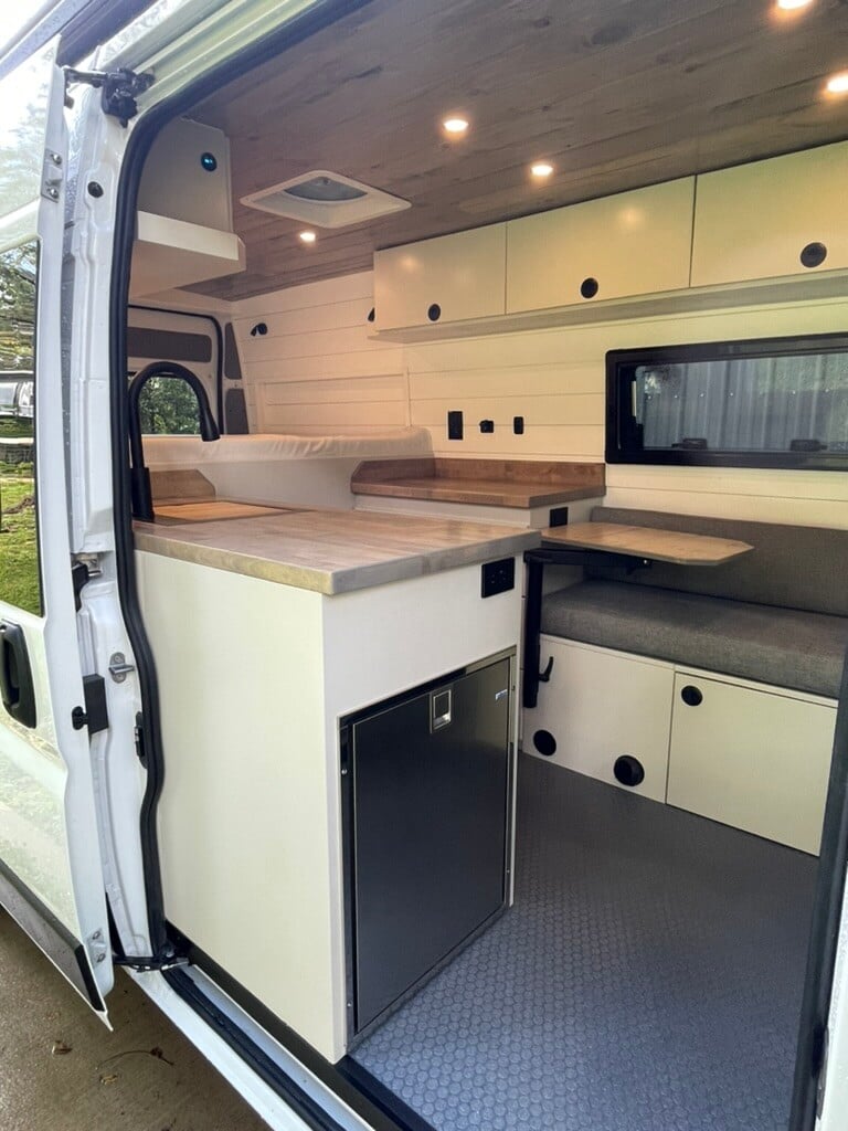 Don’t let the smaller Ram ProMaster 136WB fool you; this rig is jam-packed with goodies. Equipped with two countertops, a microwave, an AC unit, a dog bed, and more.